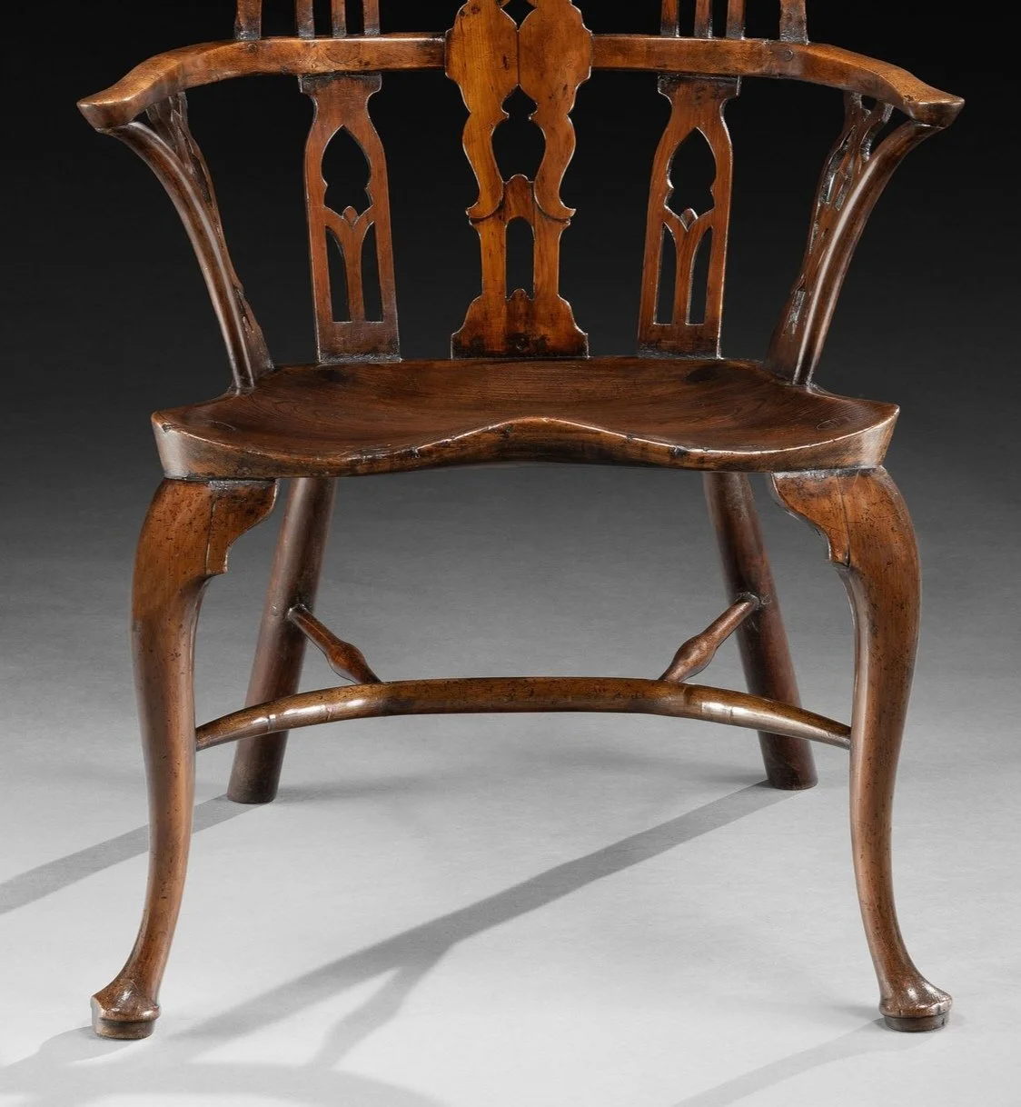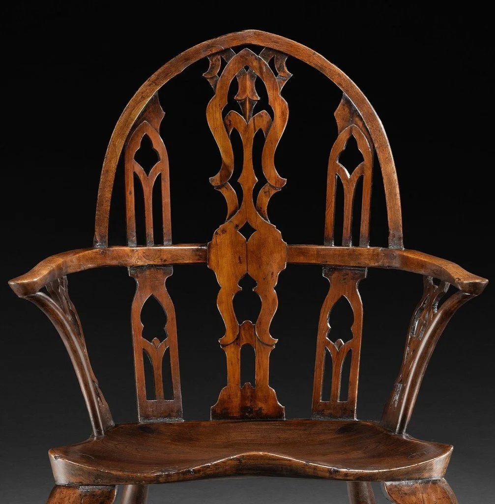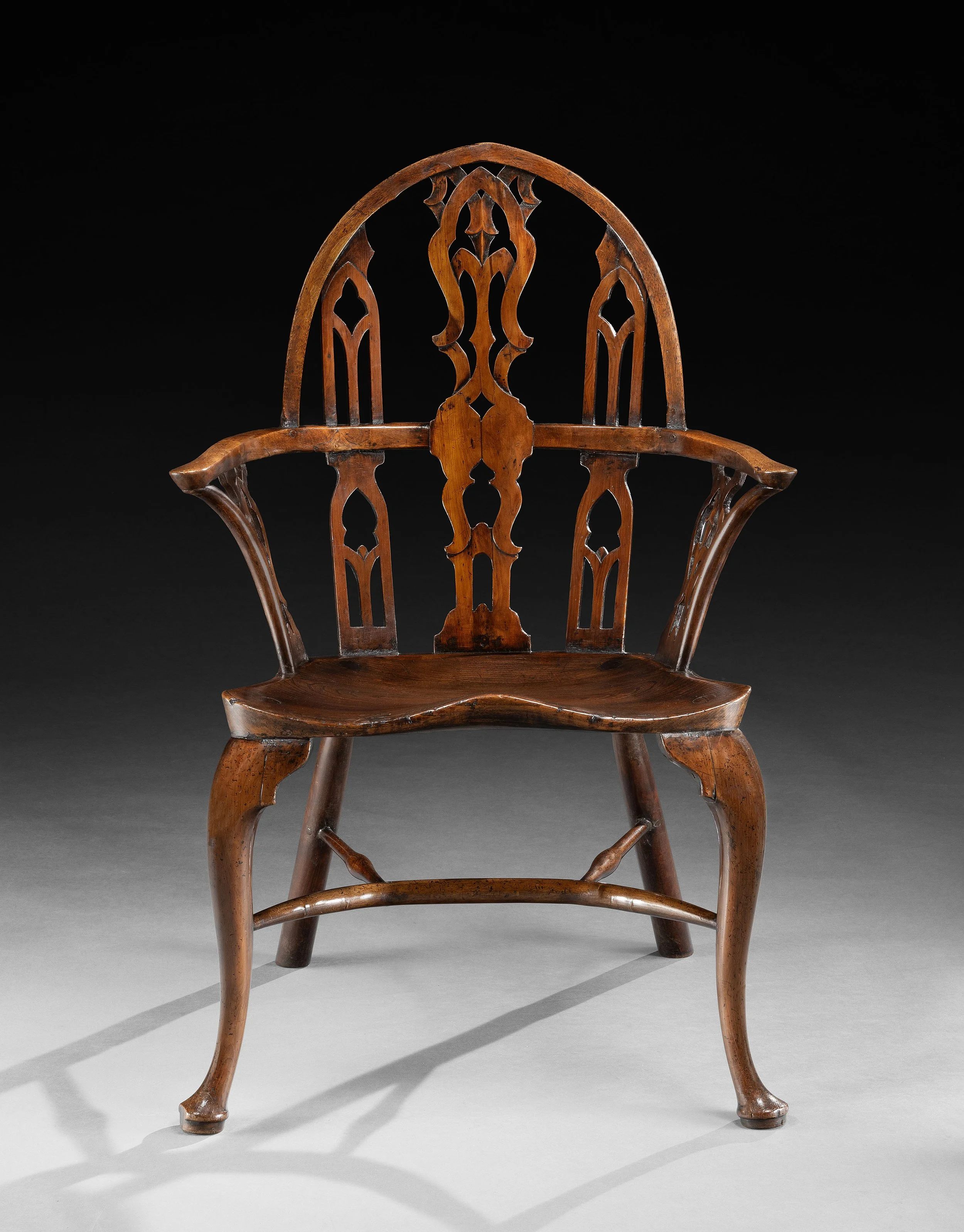 A mid 18th century windsor chair with a pointed arch-shaped back and fretwork splats displaying Gothic tracery above an elegant cabriole leg these chairs beautifully reflect the Gothic taste which became fashionable in England in the middle of the 18th century.