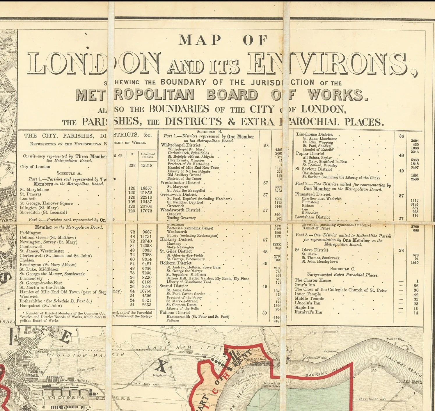 Title: Map of London and its Environs, Shewing the Boundary of the Jurisdiction of the Metropolitan Board of Works. Also the Boundaries of the City of London, the Parishes, the Districts & Extra Parochial Places.